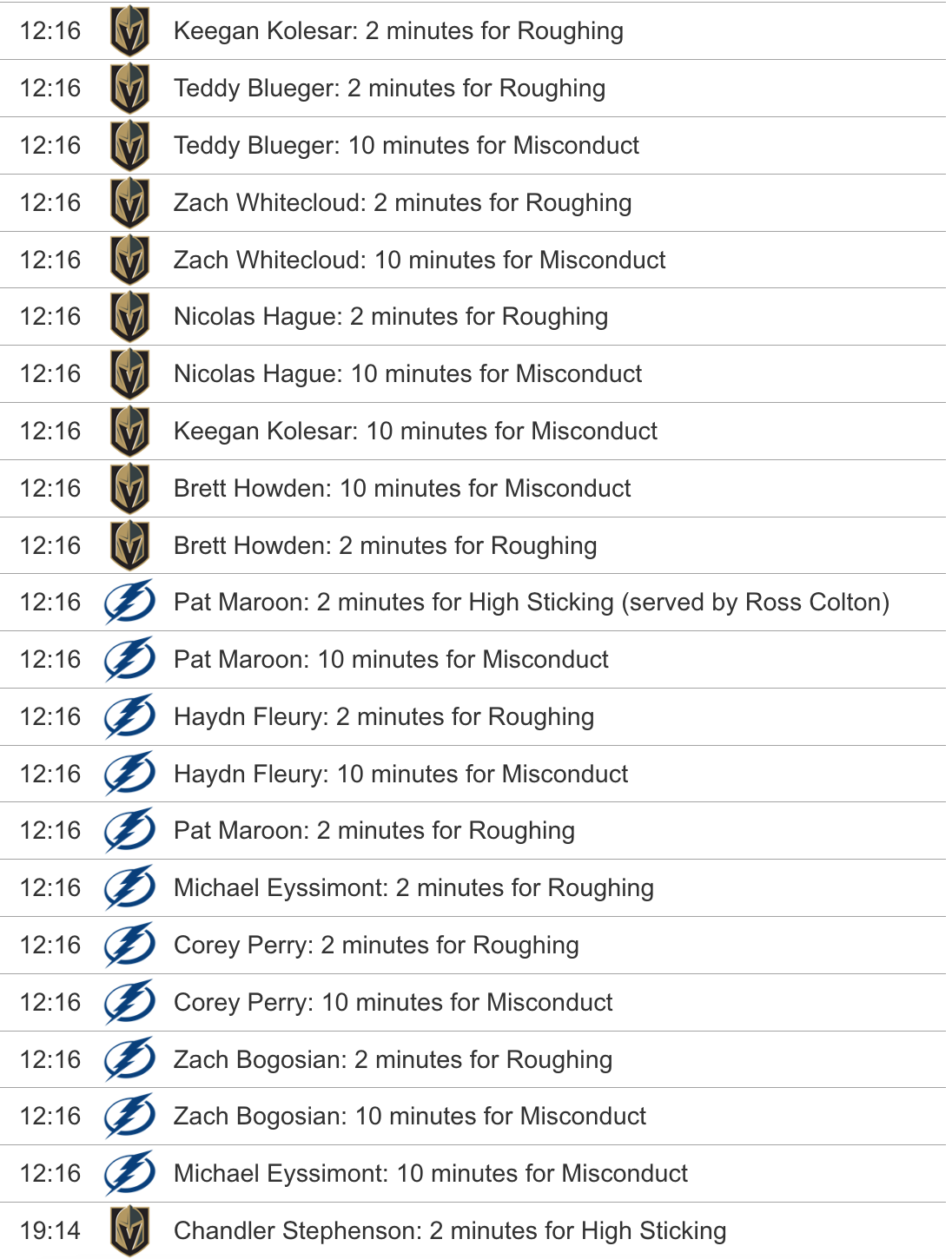 With tensions mounting between the two teams in the final period, a melee unfolded with 7:46 to go. The whole thing started when Vegas forward Keegan Kolesar delivered a late hit after the whistle, prompting Lightning forwards Pat Maroon and Corey Perry to take exception.
