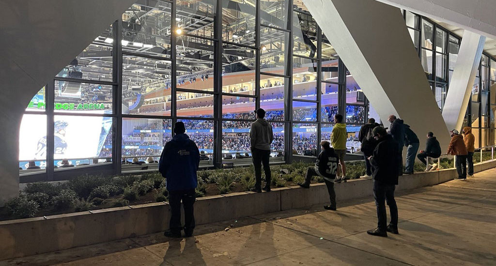 Seattle Kraken fans are able to watch their team play games at Climate Pledge Arena from outside the building. The arena is the first net zero certified arena in the world.
